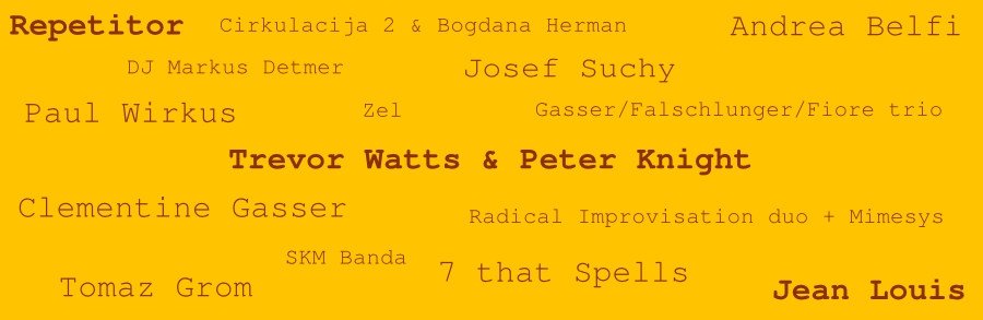 Lunes 29 de enero: 20:00 Ferrán Fages, Ruth Barberán, Alfredo Costa Monteiro (España) 21:00 Mick Beck, Dave Tucker, Paul Hession (Inglaterra) Martes 30 de enero: 20:00 Ebba Rohweder, Gregorio Kazaroff: Cine Dadá (Alemania/Argentina) 21:00 Irène Schweizer, Pierre Favre (Suiza) Miercoles 31 de enero: 20:00 Tsukiko Amakawa, Javier Carmona (Japón/ España) 21:00 Ken Vandermark, Paal Nilssen-Love (E.E.U.U./Noruega) Jue- ves 1 de febrero: 20:00 SIN RED (España) 21:00 Mat Maneri, Christophe Marguet, Herb Robertson, Claude Tchamitchian (Francia/E.E.U.U.)